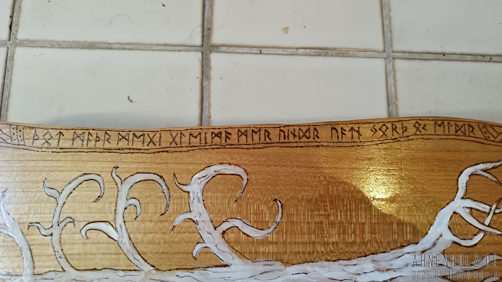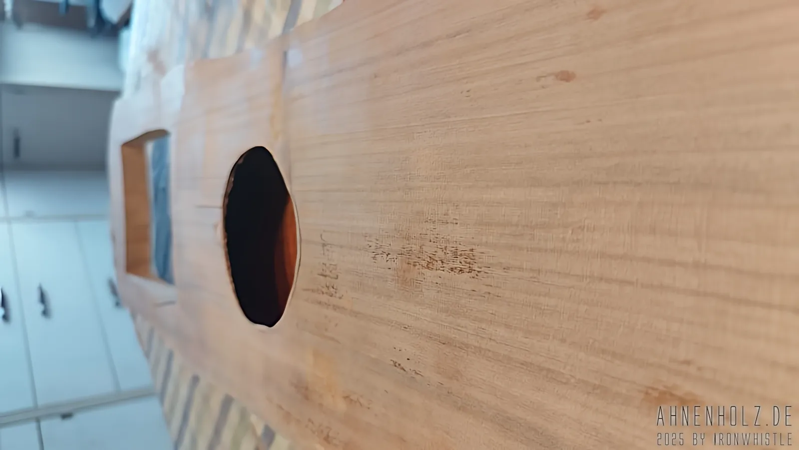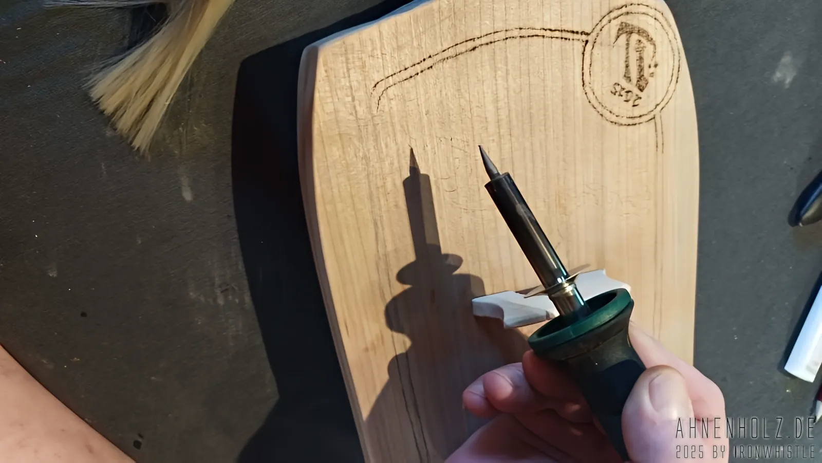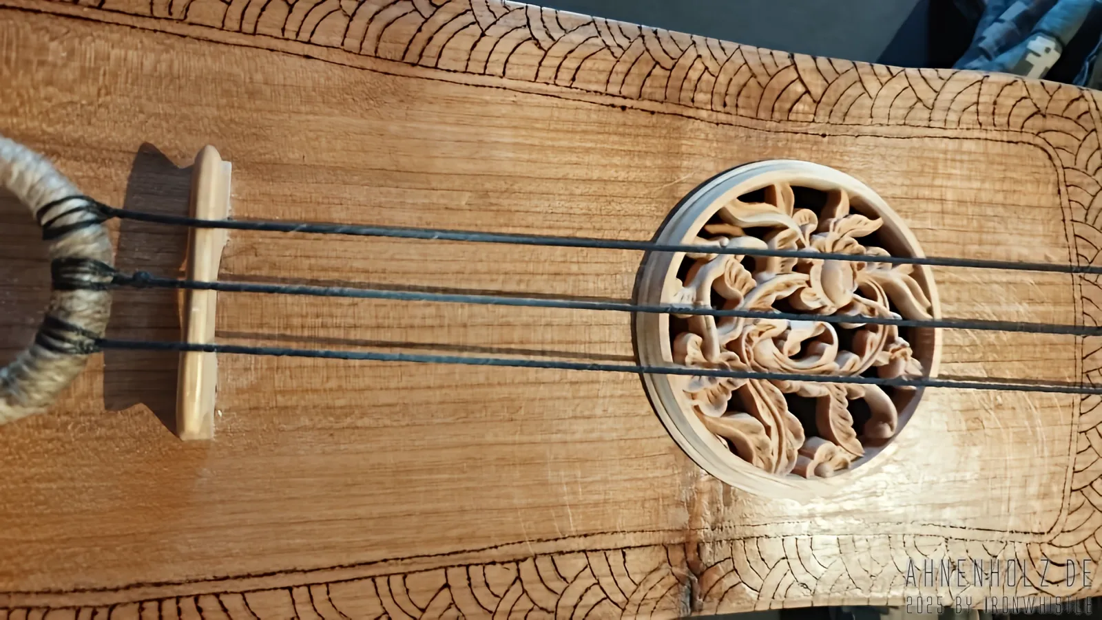 Bei dieser Talharpa kam Kirschholz aus lokalem Anbau – also dem bayrichen Wald – zum Einsatz. Da es etwas weicher ist als Eichenholz, ist der Klang ein wenig weicher und wärmer, und statt diesmal wieder mit Schlagmetall zu arbeiten, kam hier der Brennpeter und ganz einfach Farbe zum Einsatz.
