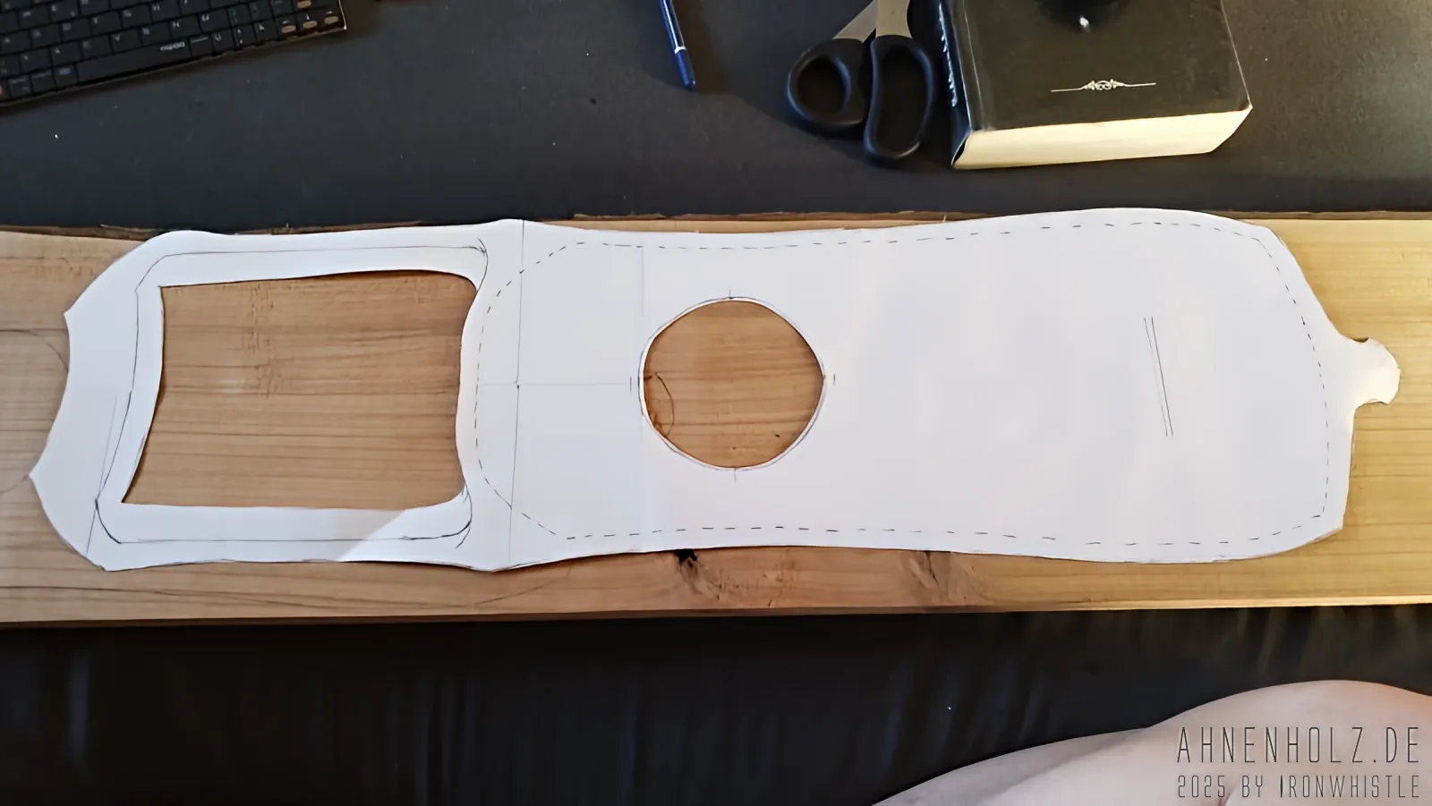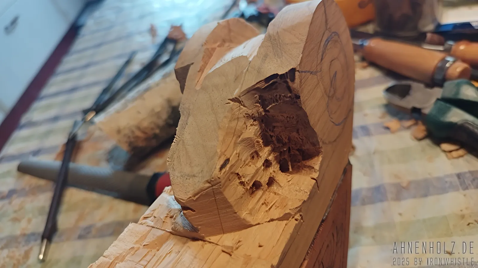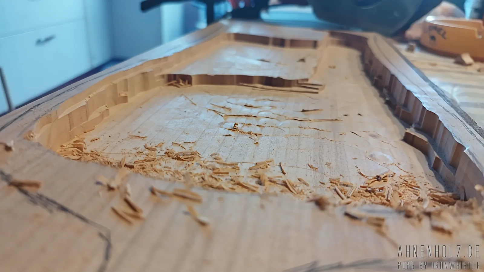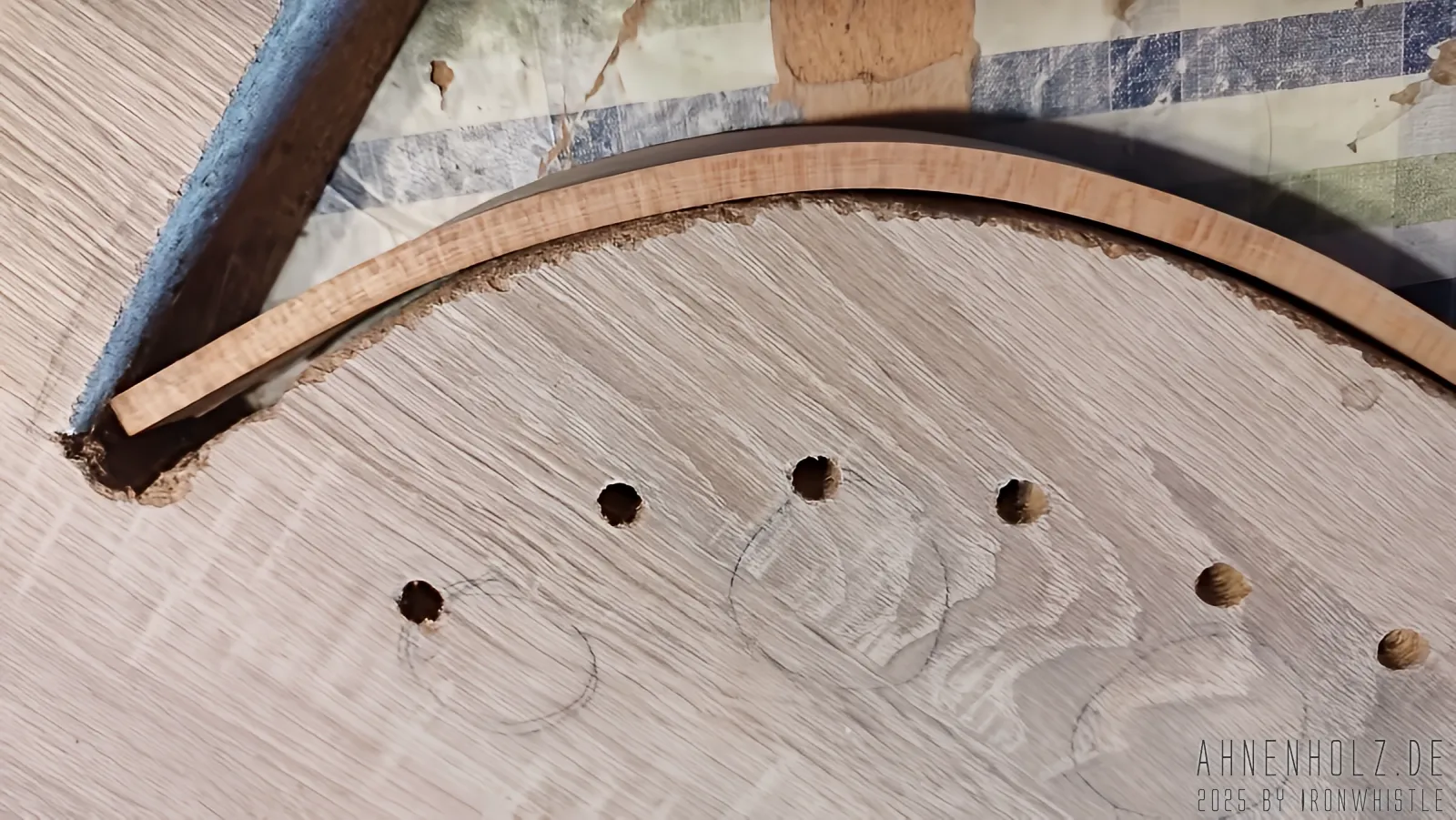 Bei dieser Talharpa kam Kirschholz aus lokalem Anbau – also dem bayrichen Wald – zum Einsatz. Da es etwas weicher ist als Eichenholz, ist der Klang ein wenig weicher und wärmer, und statt diesmal wieder mit Schlagmetall zu arbeiten, kam hier der Brennpeter und ganz einfach Farbe zum Einsatz.